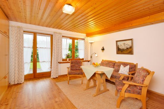 Vom Wohnraum gehen Sie nach draußen auf die nach Süden ausgerichtete Terrasse und genießen die warmen Sonnenstrahlen und den herrlichen Blick in die Oberstdorfer Berge.