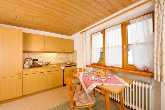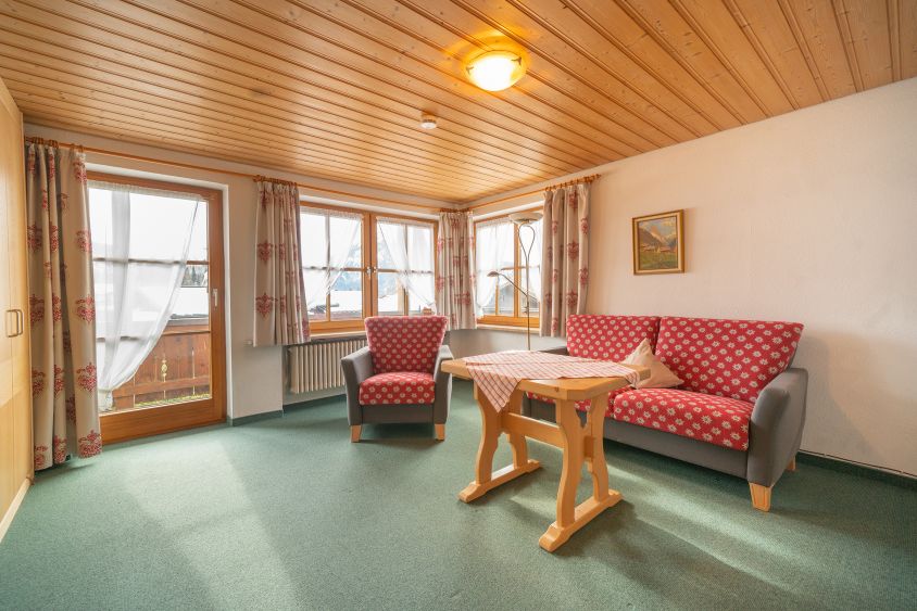 Vom Wohnraum gehen Sie nach draußen auf den nach Süden und Westen umlaufenden Balkon und genießen die warmen Sonnenstrahlen und den herrlichen Blick in die Oberstdorfer Berge.