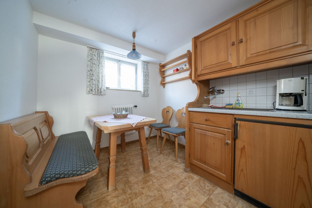 Voll ausgestattete Küchenzeile mit 4-Platten-Cerankochfeld, Backofen, Kühlschrank mit Gefrierfach, Essecke mit Tisch, Eckbank und 2 Stühlen. Geschirr ist vorhanden.