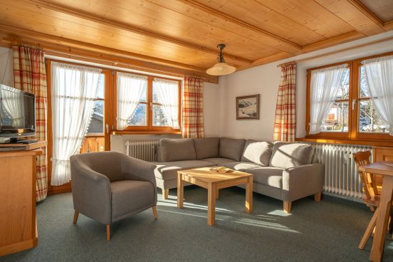 Wohnliche Sitzgarnitur mit großer Eckcouch, Tisch 2 Sessel, Essecke mit Eckbank, Tisch 2 Stühlen. Flachbildschirm, Radio, CD Player, Zimmersafe.